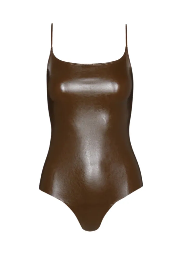 The Commando Faux Leather Cami Bodysuit – Cadet is made from our fan-favorite faux leather with adjustable straps and designed with four-way stretch and raw-cut edges. As flattering as it is chic, this bodysuit is endlessly styleable.