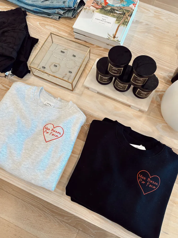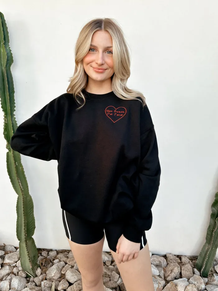 Mas Besos Sweatshirt! These sweatshirts are embroidered locally in Arizona by “Designed By Disco” featuring red embroidered lettering. This Black Style is more of an oversized fit; you can size up or down for your desired look!