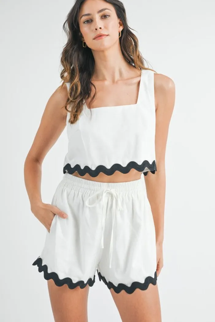 The adorable matching Wavy Linen Set – Off White is so easy and perfect for those hot summer days! Featuring an off white fabrication, square neckline, tank style crop top and matching elastic waistband with drawstring shorts, wavy black trim detauling throughout.